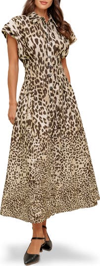 Puffed sleeves and button-down placket bring polished appeal to this leopard-print midi dress that transitions effortlessly from day to night.