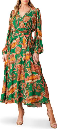 With long puff sleeves, a surplice V-neckline, and a waist-cinching belt—this midi is made for making an entrance.