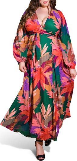 Feel your finest in a vibrant print maxi dress featuring long blouson sleeves and a soft-tied waistbelt to cinch the wrap-style silhouette.