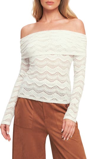 A shoulder-baring neckline enhances the romantic allure of this long-sleeve top cut from geometric-patterned stretch lace.
