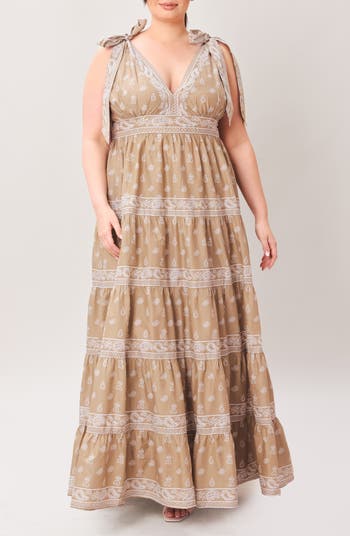An allover paisley print brings boho vibes to a tie-strap maxi dress fashioned in a breezy tiered silhouette.