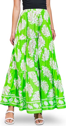 Palm Print Tiered Cotton Maxi Skirt