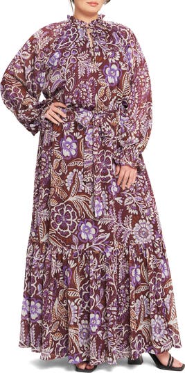 A matching tie distinguishes the waistline of a floor-grazing maxi dress that's covered in blooms and paisley swirls for a boho-inspired look.
