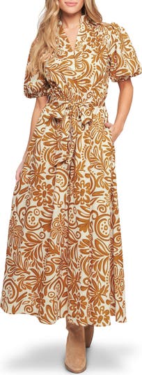Perfect for coffee catch ups or weekend brunch, this midi-length dress is styled with a cinching tie belt and romantic puff sleeves.