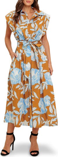 You're sure to turn heads in a stunning midi-length shirtdress designed with waist-cinching belt, a softly gathered bodice and a voluminous skirt furnished with handy pockets.