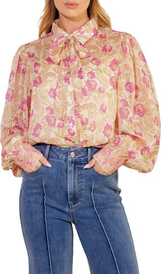 Metallic pinstripes illuminate the blooming print and airy woven fabric of a long-sleeve top framed by a tied neckline that's knotted into a charming bow.
