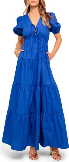 Gathered seams enhance the puff sleeves of this charming maxi dress styled with a flirty bow-tied V-neckline and a flowy tiered skirt for effortless guest-of-honor appeal.