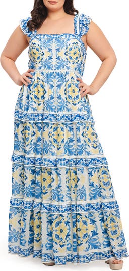 A vintage-inspired print brightens this flowy maxi dress fashioned with ruffled straps and a fitted, smocked-back bodice above a gracefully tiered skirt.