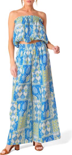 A folk-style block print brings vacation vibes to a coordinated set with boho flair. The strapless top is framed with tassel-tipped tie at the gathered neckline and bubble hem. The wide-leg pants include a stretchy waistband and handy pockets for a practical finish.