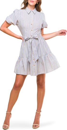 Multicolor stripes brighten a charming fit-and-flare shirtdress framed by pretty puff sleeves, a removable tie belt and a fluttery flounced hem.