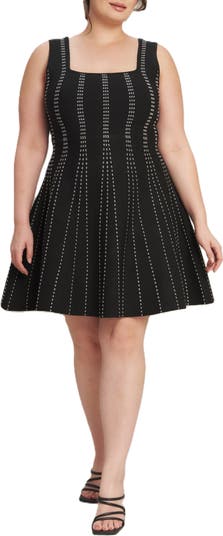 Silvery threads illuminate the flattering stripes that define a sweater-dress crafted in a fit-and-flare silhouette.