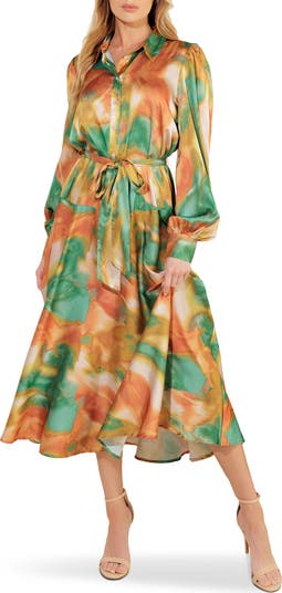 An abstract print in tropical hues washes across this graceful shirtdress fashioned with billowy bishop sleeves and a flowy skirt.