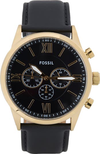 Stay on track with this sporty chronograph watch featuring precise three-hand movement, three subdials and a secure black-leather strap.
