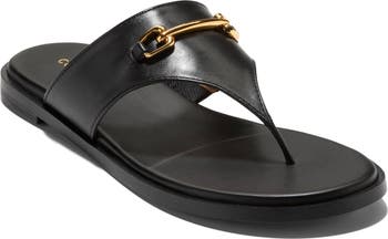 This thong sandal features a sleek silhouette accented by a classic horsebit detail for a refined, polished finish.