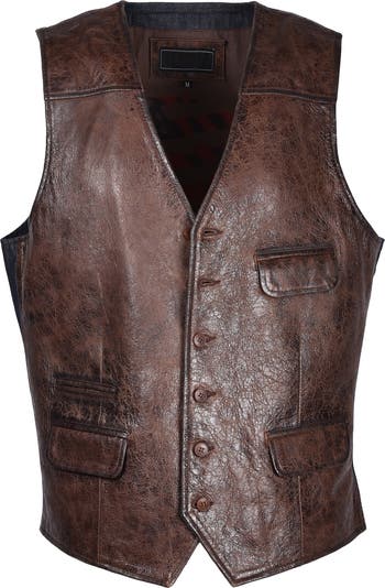 Tumbled leather has a worn-in look that adds to the edgy style of this versatile vest with classic details, a burnished finish and denim back.