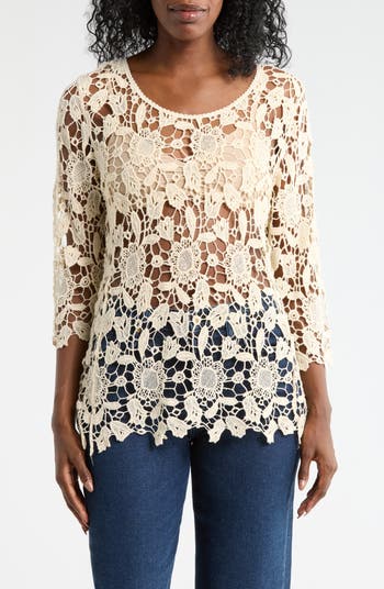 Flowery lace brings a sweet aesthetic to a sheer long-sleeve top fashioned in a longline silhouette.
