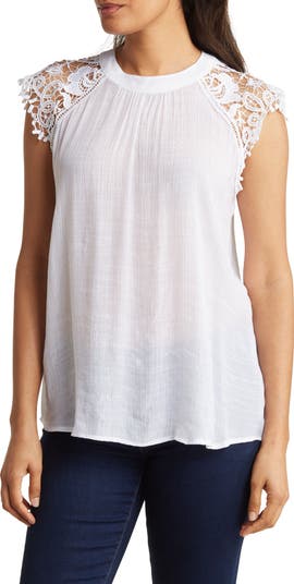 Crocheted cap sleeves create textural dimension on this woven blouse in a solid hue for easy pairing.
