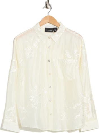 Tonally embroidered blooms create an elegant gardenscape on a woven shirt fronted by a row of shimmery buttons to complete your look.