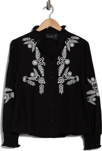High-contrast embroidery channels the bohemian aesthetic on a buttoned shirt cut from lightweight fabric for comfort and ease no matter the occasion.