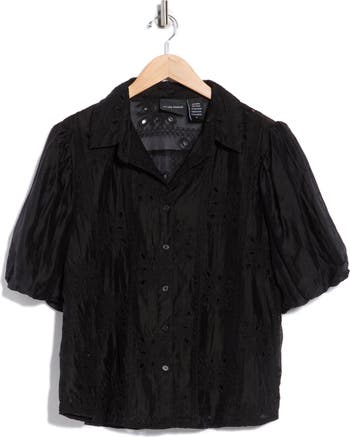 Eyelet embroidery adds airy elegance to this easygoing button-up cut from comfortable cotton and framed with romantic puff sleeves.