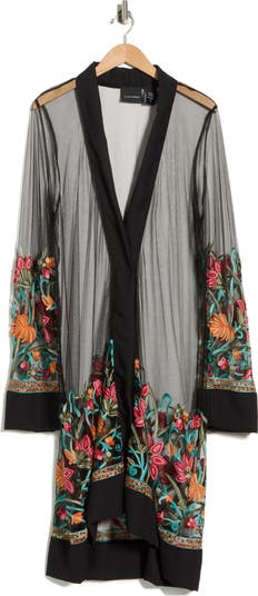 A garden of flowers blooms upon the hemline and sleeves of this sheer mesh duster perfect to layer over any weekend ensemble.