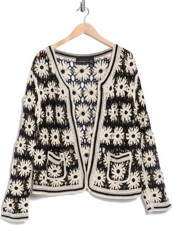 Floral open knit stitches lend cozy, homespun charm to this layer-ready cardigan.