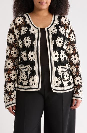 Floral open knit stitches lend cozy, homespun charm to this layer-ready cardigan.