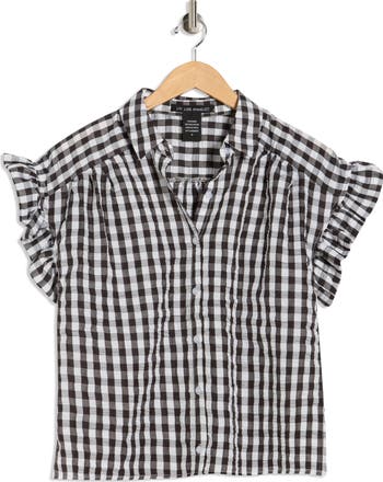Ruffled short sleeves enhance the whimsical charm of this gingham-printed button-up shirt cut from lightweight seersucker.