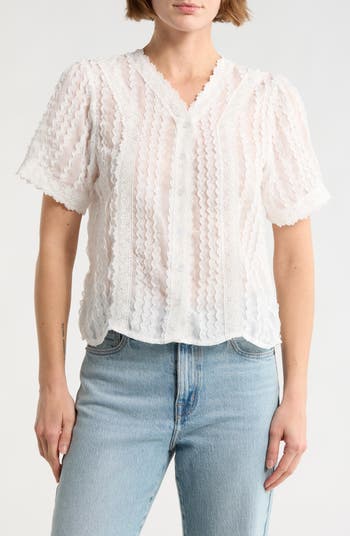 Floral lace and scalloped trim romances this short-sleeve button-up shirt framed by a V-neck.