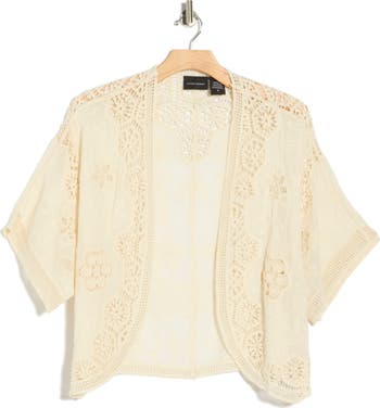 This breezy cotton top has an open-front design and boho details like sheer insets and tonal dimension.