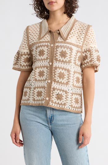 Crochet-inspired open knit stitches lend cozy, homespun charm to this polo sweater.