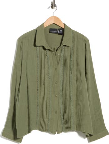 Slight pintucks and lace trim front this button-up shirt cut from crisp cotton poplin.