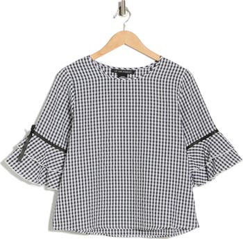 Gingham checks bring picnic-approved whimsy to a woven seersucker top framed by tiered sleeves adorned with dainty bows.