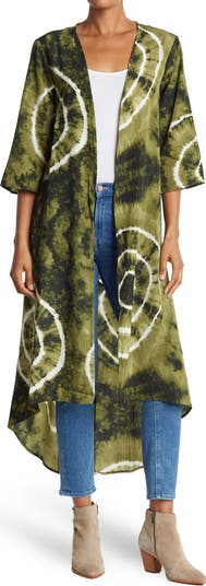 A bold tie dye print and lace panel back adds a bold, eye catching touch to this chic duster.