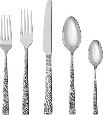 A hammered nomad pattern adds textural interest to a modern place setting crafted from polished stainless steel.