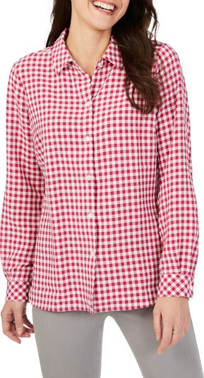 A playful gingham print enlivens this polished button-up made from a stretch fabric that's ideal from work to weekend.