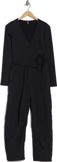 Go for a run in this one-and-done jumpsuit featuring a faux-wrap bodice and an ankle-length straight leg.