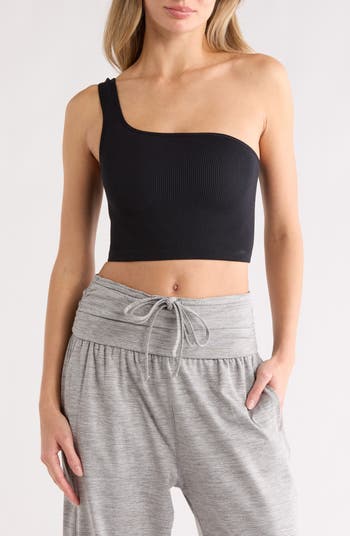 A stylish one-shoulder asymmetrical neckline adds a sophisticated touch to a sporty bra made from stretch knit fabric.