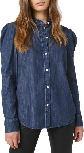 Prairie charm defines a denim shirt with pintucks and a band collar that's at home out west and everywhere else.