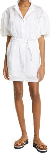 A belted waist and dramatic puff sleeves shape this lightweight woven minidress artfully trimmed with lovely lace inset.