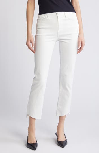 Cascading raw hems bring a casual edge to stretchy straight-leg jeans made partially with recycled fibers.