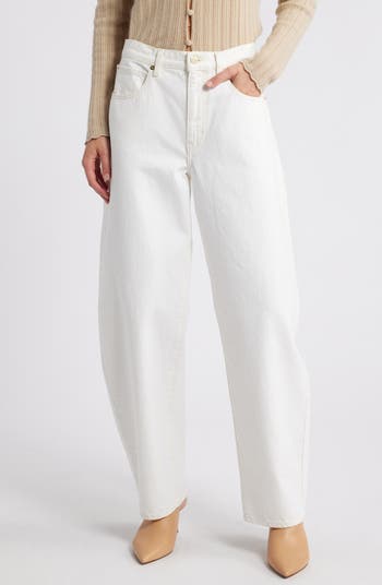 Vintage meets modern with these trendy barrel jeans sporting an aged white wash, a low-rise waist and full-length legs that curve out at the knees.