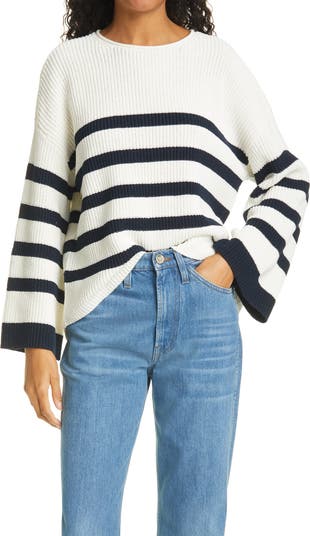 Look great on the high seas or at lunch in port in this oversized shaker-knit sweater with flared sleeves, a high/low hem and quite a bit of nautical charm.