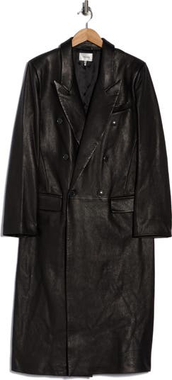 Handsome sharp peaked lapels frame the opening of this edgy double-breasted coat constructed from glossy leather.
