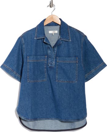 Patch pockets boost the utility-inspired style of this popover denim shirt cut in a boxy silhouette and edged by a curved high-low hem.