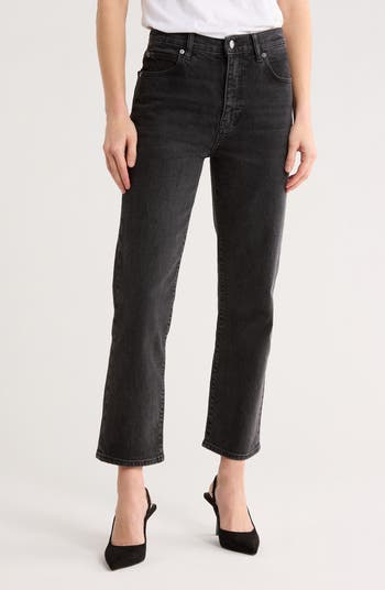 Lightly faded for a lived-in look, these low-stretch jeans feature a high waist and ankle-grazing straight legs that create a long, lean silhouette.