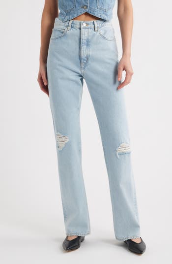 Right in between straight-leg and wide-leg, these nonstretch jeans create an elongated look with their superhigh waist and full-length inseam.