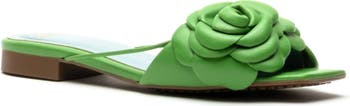 A floral appliqué and tubular side straps lend whimsical charm to a slide sandal set on a cushioned footbed for long-lasting wear.