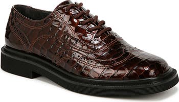 Brogue perforations and wingtip styling add sophisticated elements to a luxe oxford featuring a croc-embossed upper for modern appeal.