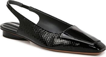 Geometric hardware at the vamp enlivens a contemporary flat fashioned with a slender square toe and elasticized slingback strap.